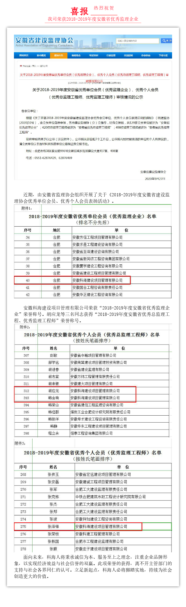 熱烈祝賀我司榮獲2018-2019年度安徽省優秀監理企業
