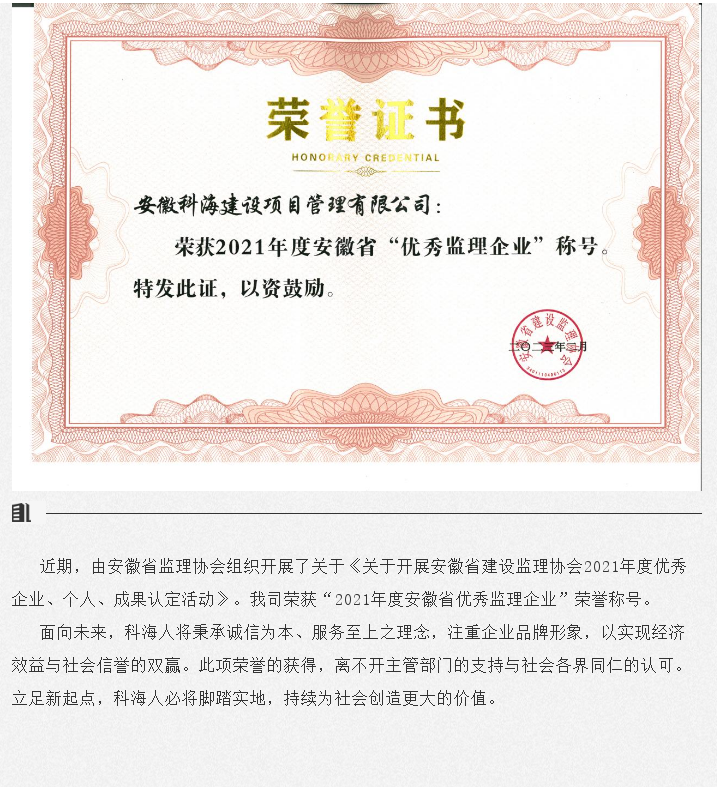 熱烈祝賀我司榮獲2021年度安徽省優(yōu)秀監(jiān)理企業(yè)